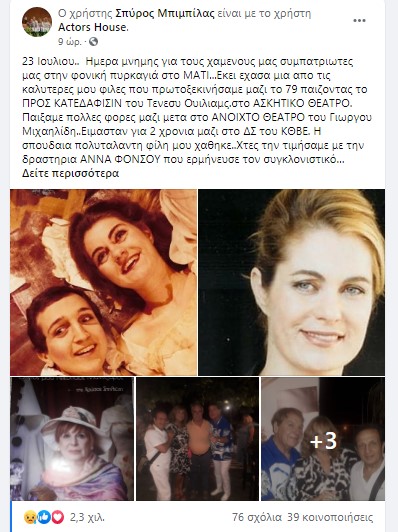 “23 Ιουλίου… Ημέρα μνήμης για τους χαμένους μας συμπατριώτες μας στη φονική πυρκαγιά στο ΜΑΤΙ…Εκεί έχασα μία από τις καλύτερές μου φίλες που πρωτοξεκινήσαμε μαζί το ΄79 παίζοντας το “Προς Κατεδάφισιν” του Τενεσί Ουίλιαμς στο Ασκητικό Θέατρο. Παίξαμε πολλές φορές μαζί μετά στο “Ανοιχτό Θέατρο” του Γιώργου Μιχαηλίδη… Ήμασταν για 2 χρόνια μαζί στο ΔΣ του ΚΘΒΕ. Η σπουδαία, πολυτάλαντη φίλη μου χάθηκε… Χτες την τιμήσαμε με την δραστήρια Άννα Φόνσου που ερμήνευσε τον συγκλονιστικό μονόλογο της Χρύσας (πολύ σημαντική και ως θεατρική συγγραφεύς) Ο γιός μου Νικόλαος Μάντζαρος στη Νέα Μάκρη… Αθάνατη Χρύσα μου…», έγραψε χαρακτηριστικά ο Σπύρος Μπιμπίλας.