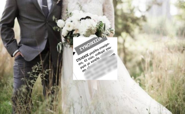 Σύμφωνα με το onlarissa.gr στη στήλη της εφημερίδας με τα συνοικέσια, το μάτι έπεσε στην αγγελία ενός 43χρονου στελέχους εταιρείας, ο οποίος αναζητά ταίρι.