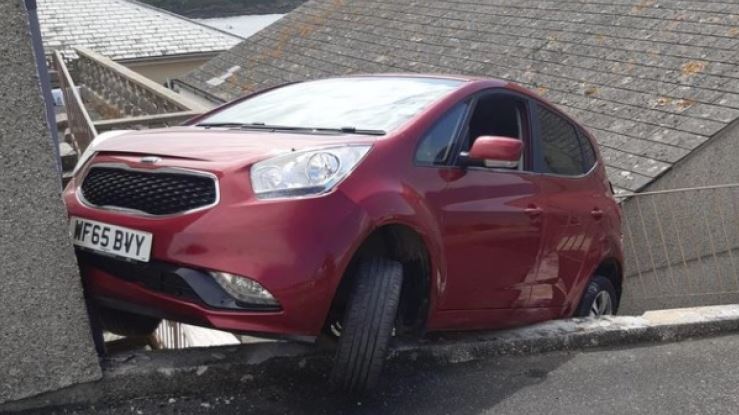 Όταν έφτασαν στο σημείο είδαν ένα κόκκινο Kia να αιωρείται σφηνωμένο σε δύο κτήρια. Η 87χρονη οδηγός του είχε βγει για φαγητό προκειμένου να γιορτάσει τα γενέθλιά του, όταν για αδιευκρίνιστο λόγο έσπασε τα προστατευτικά κάγκελα που βρίσκονταν στον δρόμο.