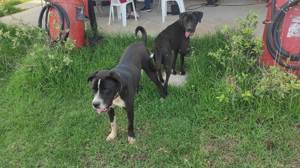 Οι 2 τετράποδοι φίλοι μας, φοράνε περιλαίμιο, είναι υπάκουοι και φιλικοί. Εμφανώς δεσποζόμενοι.