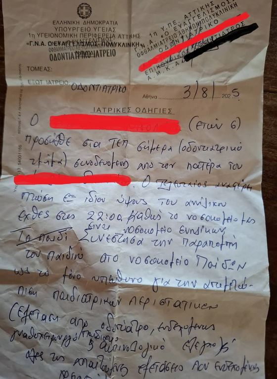 Στις 20:30, οι ιατροί του Γ.Ν.Π.Α. «Η Αγία Σοφία» επικοινώνησαν τηλεφωνικά με τον γονέα, ενημερώνοντάς τον ότι είχε προγραμματιστεί ραντεβού για τις 09:30 της 4/8/2025 στο Οδοντιατρικό Τμήμα του Γ.Ν. Παίδων Πεντέλης.