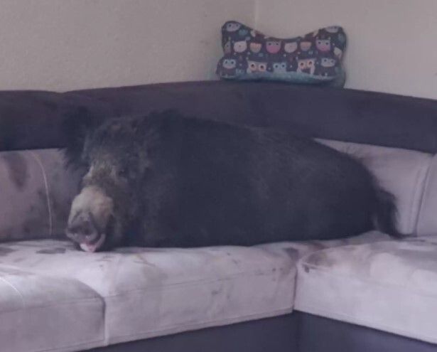 Το αγριογούρουνο αφού αναποδογύρισε τα πάντα μέσα στο σαλόνι, ίσως αναζητώντας ένα σνακ για να ξεγελάσει την πείνα του, άραξε μπρούμυτα στον καναπέ για να πάρει έναν υπνάκο.