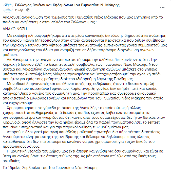 Ο Σύλλογος Γονέων και Κηδεμόνων του 1ου Γυμνασίου Ν. Μάκρης απάντησε, επίσης με ανάρτηση στο Facebook.