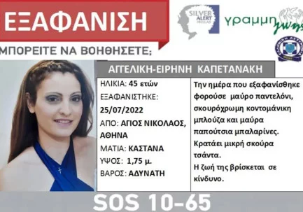 Η 45χρονη έχει καστανά μάτια,ύψος 1,75μ και είναι αδύνατη. Για τον εντοπισμό της έχει εκδοθεί Silver Alert.