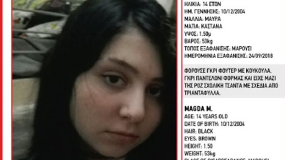 Η περιπέτεια της Μάγδα Μ., 14 ετών, έληξε χθες το απόγευμα δίνοντας τέλος στην αγωνία των δικών της ανθρώπων που την αναζητούσαν. Η Μάγδα Μ. βρέθηκε στο Ηράκλειο Αττικής και είναι καλά στην υγεία της.