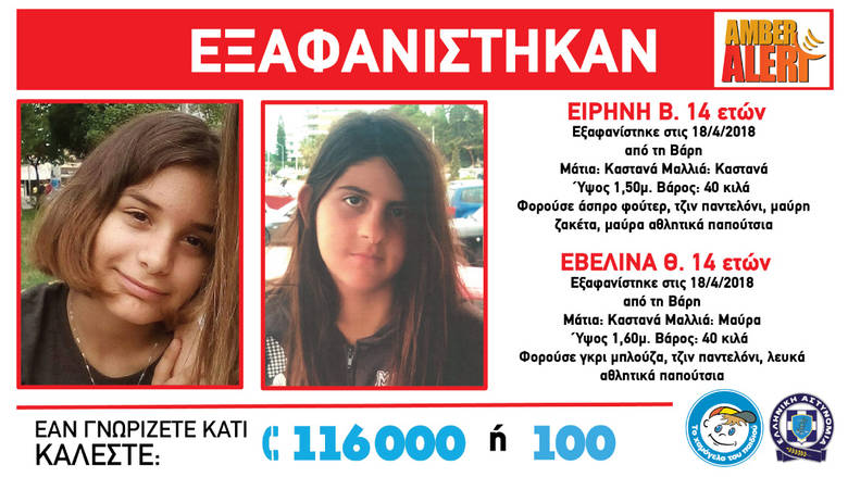 «Στις 18/4/2018 και ώρα 13:20, εξαφανίστηκαν από την περιοχή της Βάρης, η Ειρήνη Β. 14 ετών και η Εβελίνα Θ. 14 ετών. Η Ειρήνη Β. έχει καστανά μαλλιά και καστανά μάτια, έχει ύψος 1, 50 μ. και ζυγίζει 40 κιλά. Την ημέρα που εξαφανίστηκε φορούσε άσπρο φούτερ, μαύρη ζακέτα, τζιν παντελόνι και μαύρα αθλητικά παπούτσια. Η Εβελίνα Θ. έχει μαύρα μαλλιά και καστανά μάτια, έχει ύψος 1, 60 μ. και ζυγίζει 40 κιλά. Την ημέρα που εξαφανίστηκε φορούσε γκρι μπλούζα, τζιν παντελόνι και λευκά αθλητικά παπούτσια».