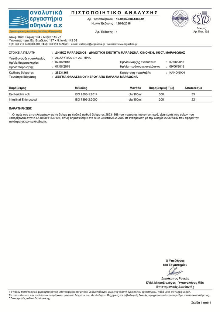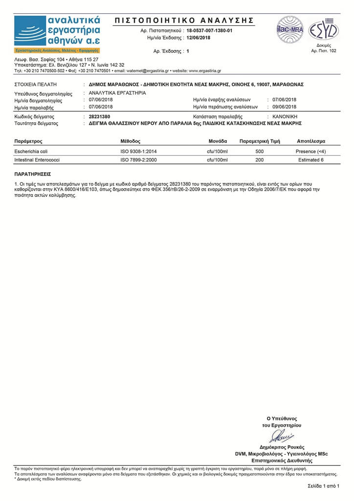 Δεδομένου, αντίθετα, ότι ο Δήμος Μαραθώνα ανέθεσε τις μετρήσεις στα πιστοποιημένα βιολογικά «Αναλυτικά Εργαστήρια Αθηνών Α.Ε.» (τις οποίες μπορείτε να δείτε αναλυτικά), κρατάμε τις επίσημες αναλύσεις για το 2018 που θέλουν όλες τις θάλασσες της περιοχής πεντακάθαρες…