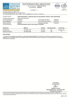Η λήψη και η ανάλυση των δειγμάτων έγινε από τα πιστοποιημένα “Αναλυτικά Εργαστήρια Αθηνών Α.Ε.”. Σύμφωνα με τα Πιστοποιητικά Ανάλυσης, οι τιμές των αποτελεσμάτων όλων των δειγμάτων είναι εντός των ορίων που καθορίζονται με την ΚΥΑ 8600/416/Ε103, όπως δημοσιεύθηκε στο ΦΕΚ 356/Τβ/26-02-2009, σε εναρμόνιση με την Οδηγία 2006/7/ΕΚ που αφορά την ποιότητα ακτών κολύμβησης. Ακόμα και δείγματα που ελήφθησαν από το παλιό και το νέο λιμάνι αποδεικνύουν την καθαρότητα της θάλασσας.