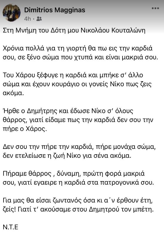 «Στη Μνήμη του Δότη μου Νικολάου Κουταλώνη