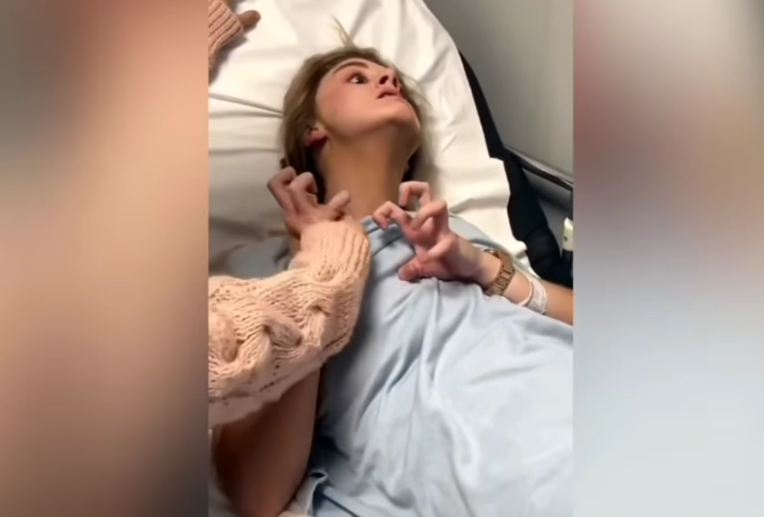 Στο ανατριχιαστικό βίντεο η 18χρονη διακρίνεται ξαπλωμένη στο κρεβάτι νοσοκομείου να στρέφει το κεφάλι της από τη μία πλευρά στην άλλη προσπαθώντας να ψελλίσει κάποιες κουβέντες από το «στραβωμένο» σαγόνι της με τα χέρια της σηκωμένα και τα δάκτυλά της κυρτωμένα λες και προσπαθούσε να γαντζωθεί από κάπου για να βγει από την κόλασή της. «Έδειχνε λες και την είχε καταλάβει κάποις δαίμονας», είπε η μητέρα της στη βρετανική εφημερίδα The Mirror. «Όταν της μίλησα είδα ότι ήταν παρούσα, προσπαθούσε να κρατήσει επαφή με τα μάτια της μαζί μου, αλλά αδυνατούσε να μιλήσει».