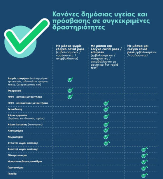 Συγκεκριμένα, όλοι οι ενήλικες ανεμβολίαστοι πολίτες, δεν θα γίνονται δεκτοί σε κανέναν κλειστό χώρο ούτε καν με την επίδειξη τεστ. Αυτό σημαίνει ότι αποκλείονται από κάθε είδους διασκέδαση όπως: σινεμά, θέατρα, μουσεία, εκθέσεις, συνέδρια, γήπεδα και γυμναστήρια. Με rapid test θα μπορούν ωστόσο να ταξιδεύουν με τις υπεραστικές συγκοινωνίες, να πηγαίνουν στην δουλειά τους, στην εκκλησία, στο λιανεμπόριο, στο κομμωτήριο και σε ανοικτούς χώρους εστίασης.