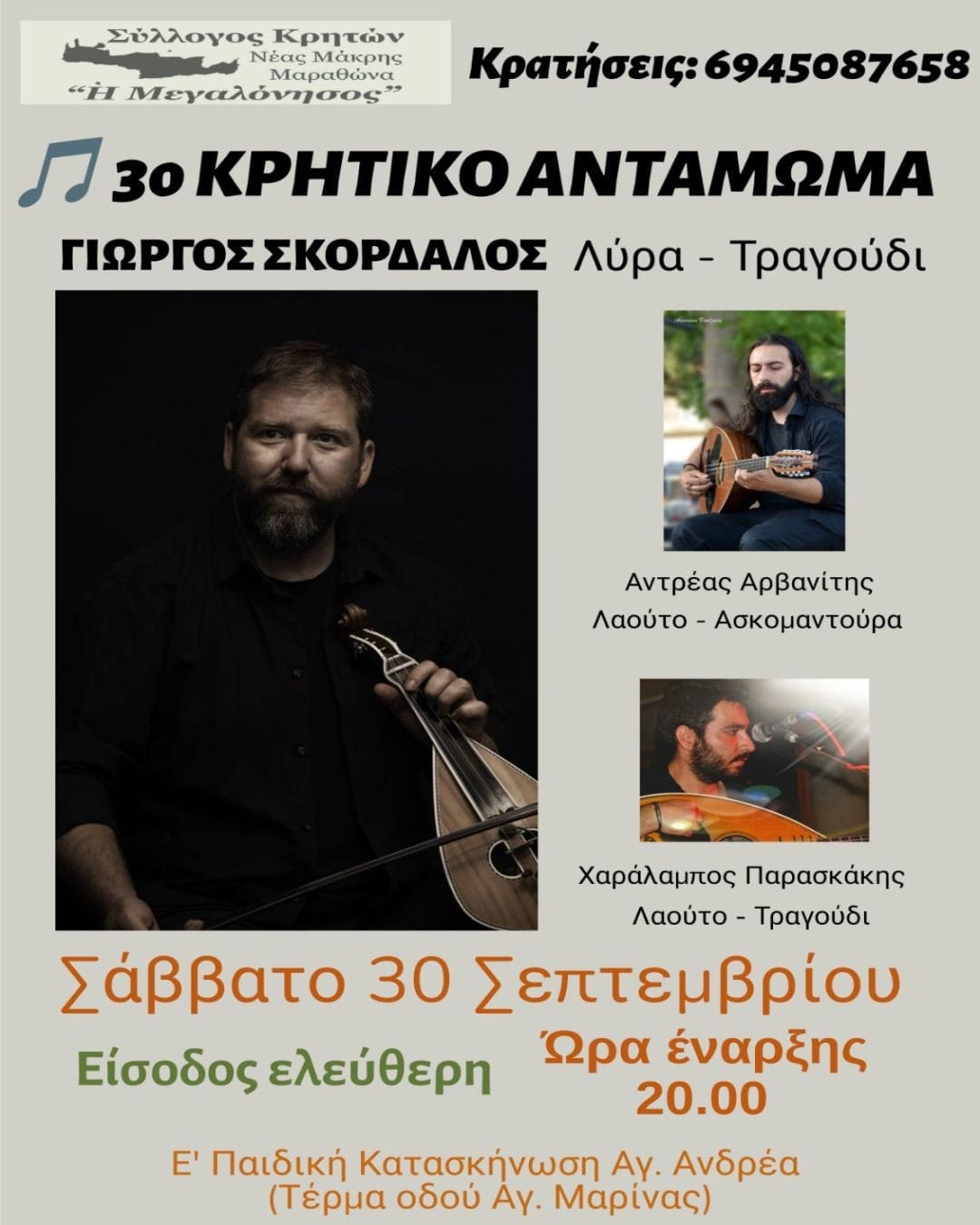 Βραδιά γλεντιού, κρητικής μουσικής και μπόλικης ρακής είναι η αποψινή καθώς ο Σύλλογος Κρητών Νέας Μάκρης διοργανώνει το 3ο Κρητικό Αντάμωμα.