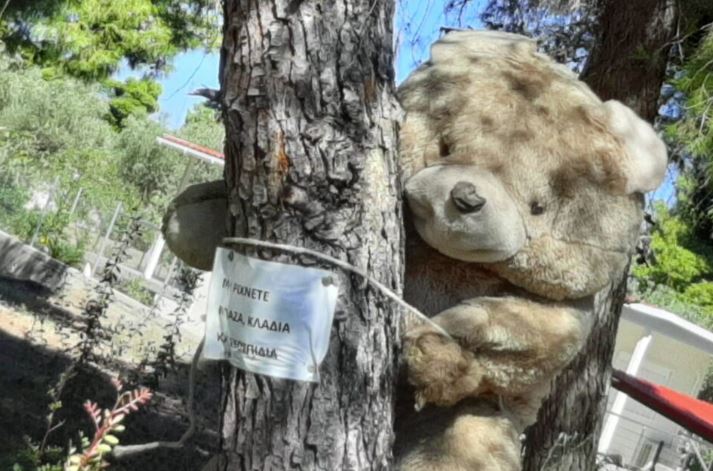Έκπληξη προκάλεσε στους περαστικούς μία λούτρινη αρκούδα που βρέθηκε κρεμασμένη σε ένα πεύκο, σε γνωστό δρόμο στον οικισμό Ζούμπερι.