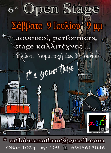 Η artlab ΤεχνώνΠόλις Μαραθώνος διοργανώνει εκδήλωση “ανοιχτής σκηνής” και προσκαλεί μουσικούς, τραγουδιστές, ηθοποιούς, performers και γενικά stage καλλιτέχνες να εκφραστούν στο πλαίσιο εκδήλωσης που θα γίνει το Σάββατο 9 Ιουλίου 2022 στις 21.00 στο χώρο της. Οδός Ηγ. Μαρ. Κουμάντου (πρώην 102) αρ. 109, Ν. Μάκρη.