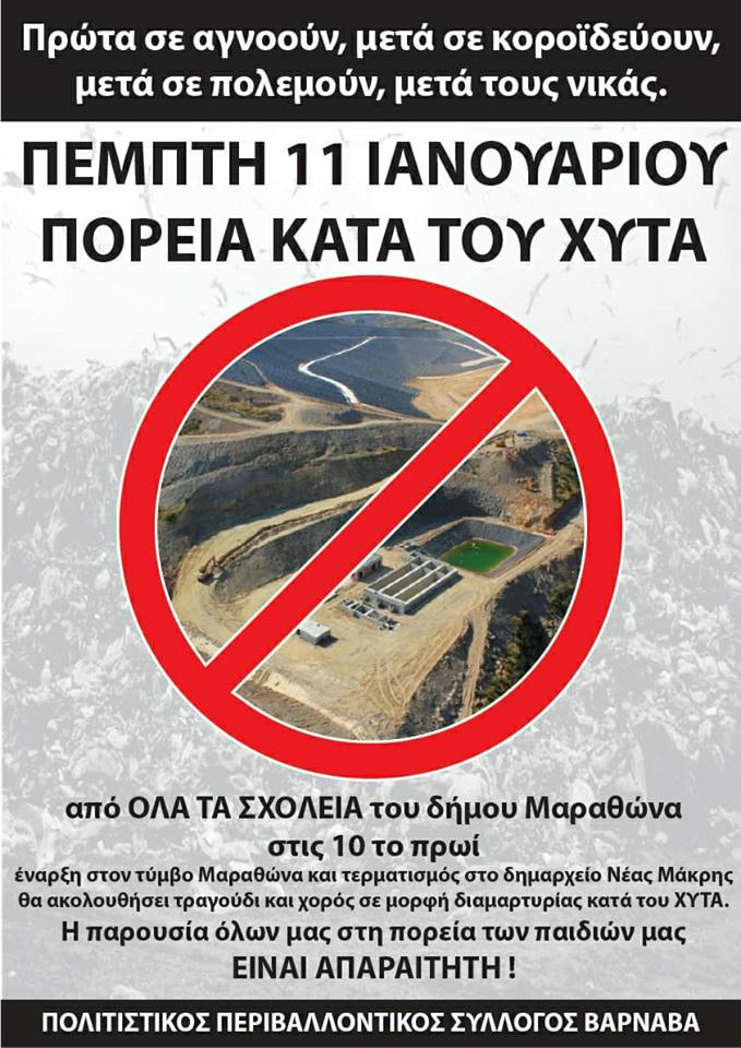 Με πρωτοβουλία των μαθητών των σχολείων του Δήμου Μαραθώνα θα πραγματοποιηθεί πορεία κατά του ΧΥΤΑ στο Γραμματικό από τον Τύμβο του Μαραθώνα έως το Δημαρχείο της Νέας Μάκρης, αύριο Πέμπτη 11 Ιανουαρίου 2018, στις 10:00 το πρωί.