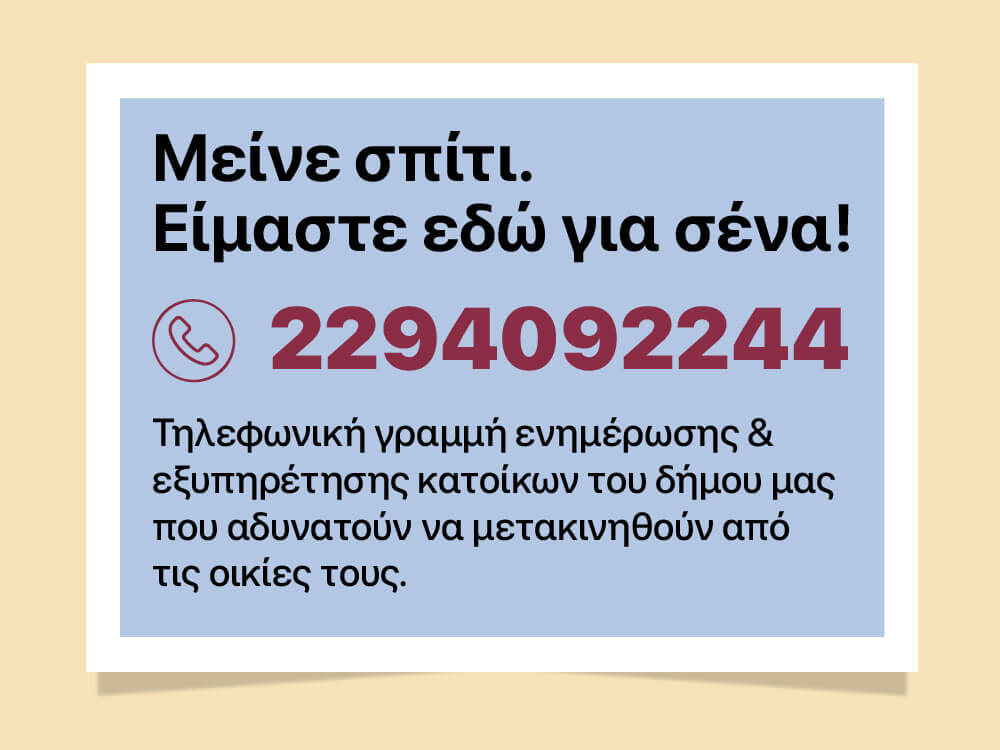Οι συμπολίτες μας που αδυνατούν, ή δυσκολεύονται, λόγω της πανδημίας να κυκλοφορήσουν για την προμήθεια αναγκαίων ειδών, μπορούν να απευθύνονται τηλεφωνικά στο 22940 92244 για την καταγραφή των αναγκών τους και τον προγραμματισμό της εξυπηρέτησής του κατ’ οίκον.