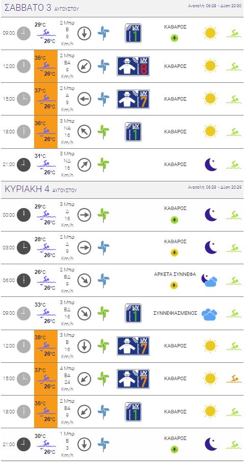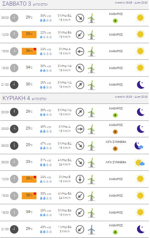 Σήμερα Σάββατο θα έχουμε μέχρι και 37 βαθμούς με ένταση ανέμων που θα φτάνει τα 3 μποφόρ, ενώ αύριο Κυριακή η μέρα θα είναι ελαφρώς πιο ζεστή, καθώς η θερμοκρασία θα φτάσει μέχρι και τους 38 βαθμούς στα ανώτερα επίπεδά της, με την ένταση των ανέμων στα 4 μποφόρ.