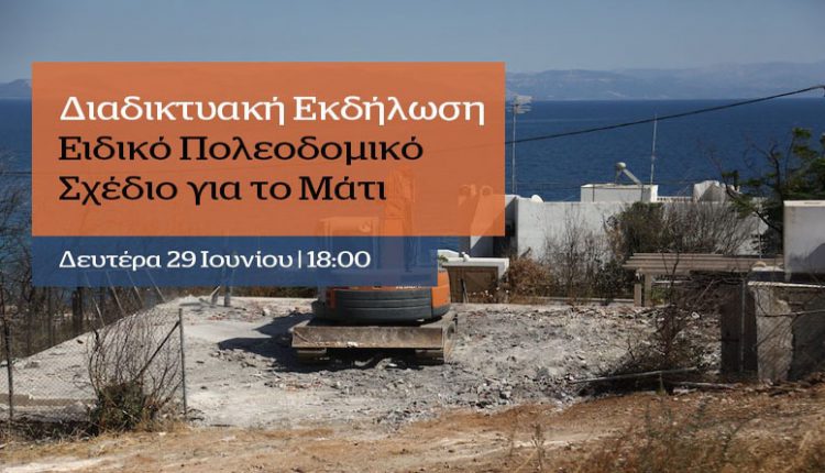 Διαδικτυακή εκδήλωση με θέμα «Ειδικό Πολεοδομικό σχέδιο: Οικισμός Πρότυπο ή Επανάληψη των λαθών του παρελθόντος;» πραγματοποιεί στις 29 Ιουνίου στις 18:00 το Παρατηρητήριο για το Μάτι, με τη στήριξη της Πρωτοβουλίας για τη Δημοσιογραφία.