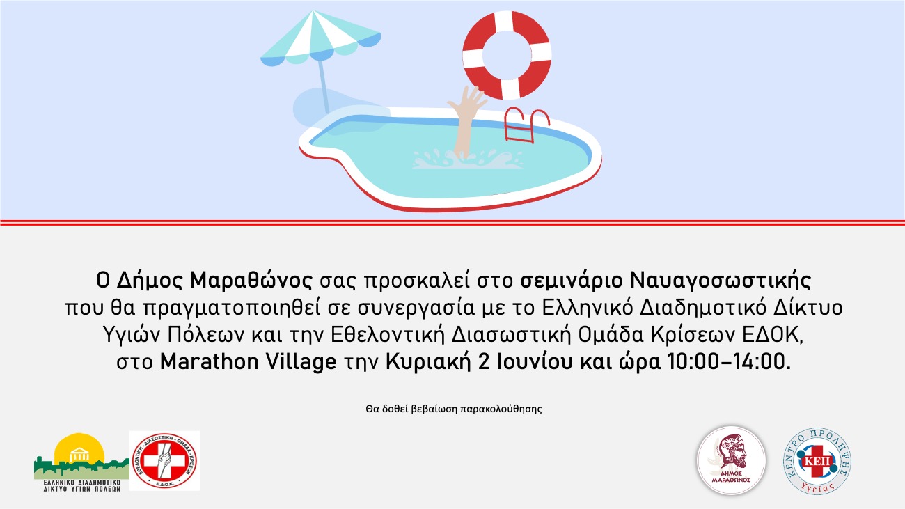 Το Ελληνικό Διαδημοτικό Δίκτυο Υγιών Πόλεων – Προαγωγή Υγείας (ΕΔΔΥΠΥ), σε συνεργασία με τον Δήμο Μαραθώνος, το ΚΕΠ Υγείας του Δήμου μας και την Εθελοντική Διασωστική Ομάδα Κρίσεων(ΕΔΟΚ), διοργανώνει τη Κυριακή 2 Ιουνίου και ώρα 10:00-14:00, στο Marathon Village, το εξαιρετικά χρήσιμο σεμινάριο «Γνωριμία με τη Ναυαγοσωστική».