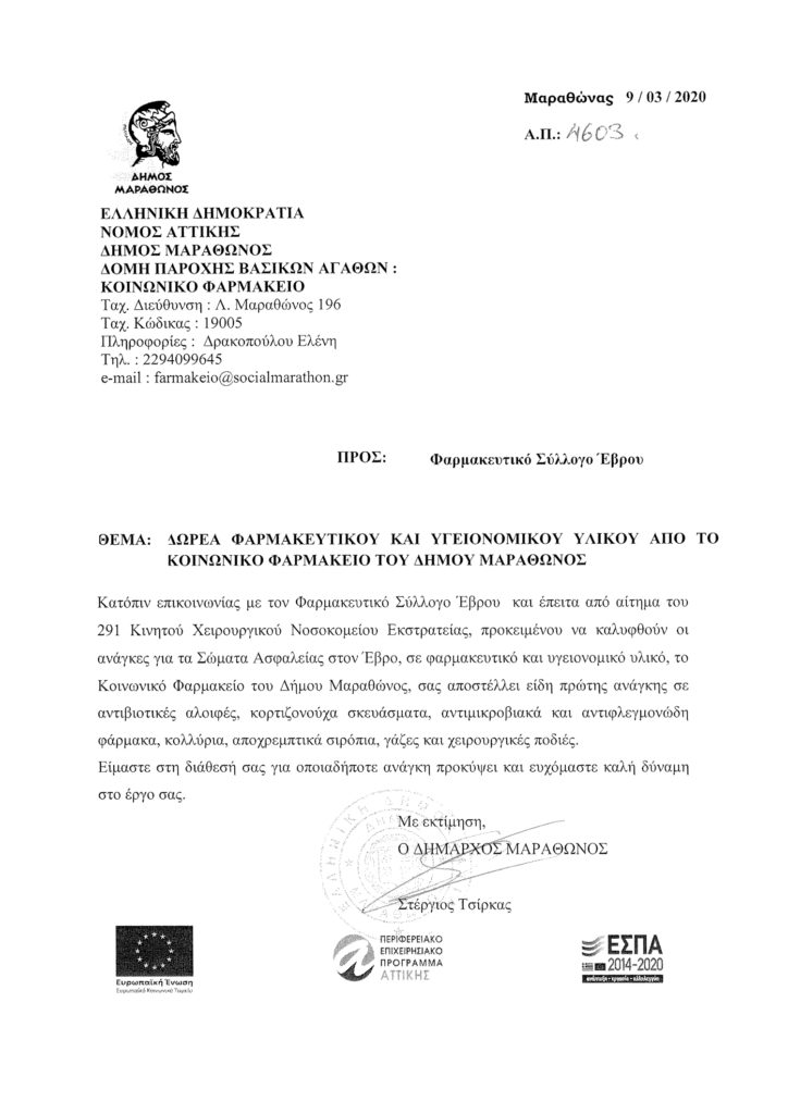 Έπειτα από έκκληση του 291 Κινητού Χειρουργικού Νοσοκομειακού Εκστρατείας στον Έβρο για αποστολή φαρμακευτικού και υγειονομικού υλικού, ο Δήμος Μαραθώνα αποστέλλει είδη πρώτης ανάγκης, όπως ανακοίνωσε σε σχετική επιστολή του ο δήμαρχος Μαραθώνα, Στέργιος Τσίρκας.