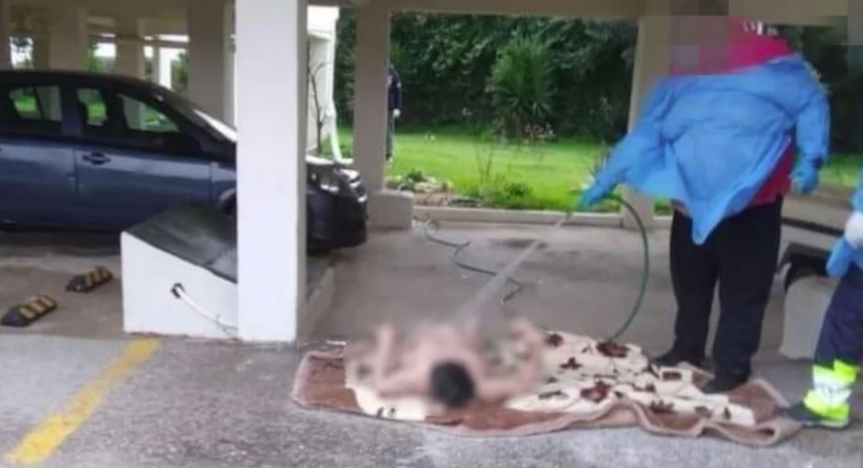 Σε αυτή διακρίνεται μια γυναίκα ξαπλωμένη πάνω σε κουβέρτα χωρίς τα ρούχα της, την οποία νοσηλευτικό πλήρωμα ασθενοφόρου την πλένει με λάστιχο σε πυλωτή πολυκατοικίας.