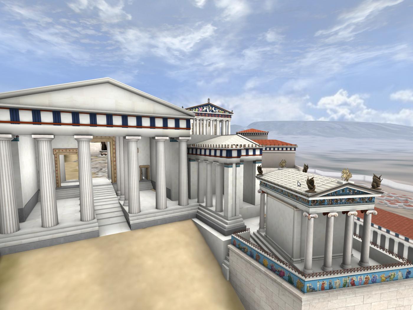 Παράλληλα, παρουσιάζονται ναοί και αγάλματα τα οποία δεν διασώζονται μέχρι σήμερα όπως το Αρρηφόριον, το Ιερό του Διός Πολιέως, το Ιερό της Αρτέμιδος Βραυρωνίας, η Χαλκοθήκη, ο γλυπτός διάκοσμος του Παρθενώνα με το χρυσελεφάντινο άγαλμα της θεάς Αθηνάς κ.α.