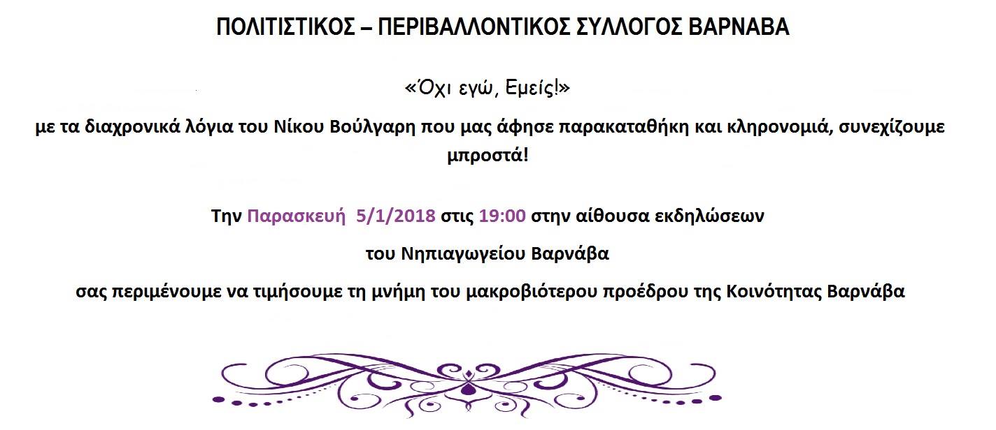 Ο Πολιτιστικός & Περιβαλλοντικός Σύλλογος Βαρνάβα σας προσκαλεί σε μια εκδήλωση μνήμης και τιμής του μακροβιότερου προέδρου της Κοινότητας Βαρνάβα, Νίκο Βούλγαρη.