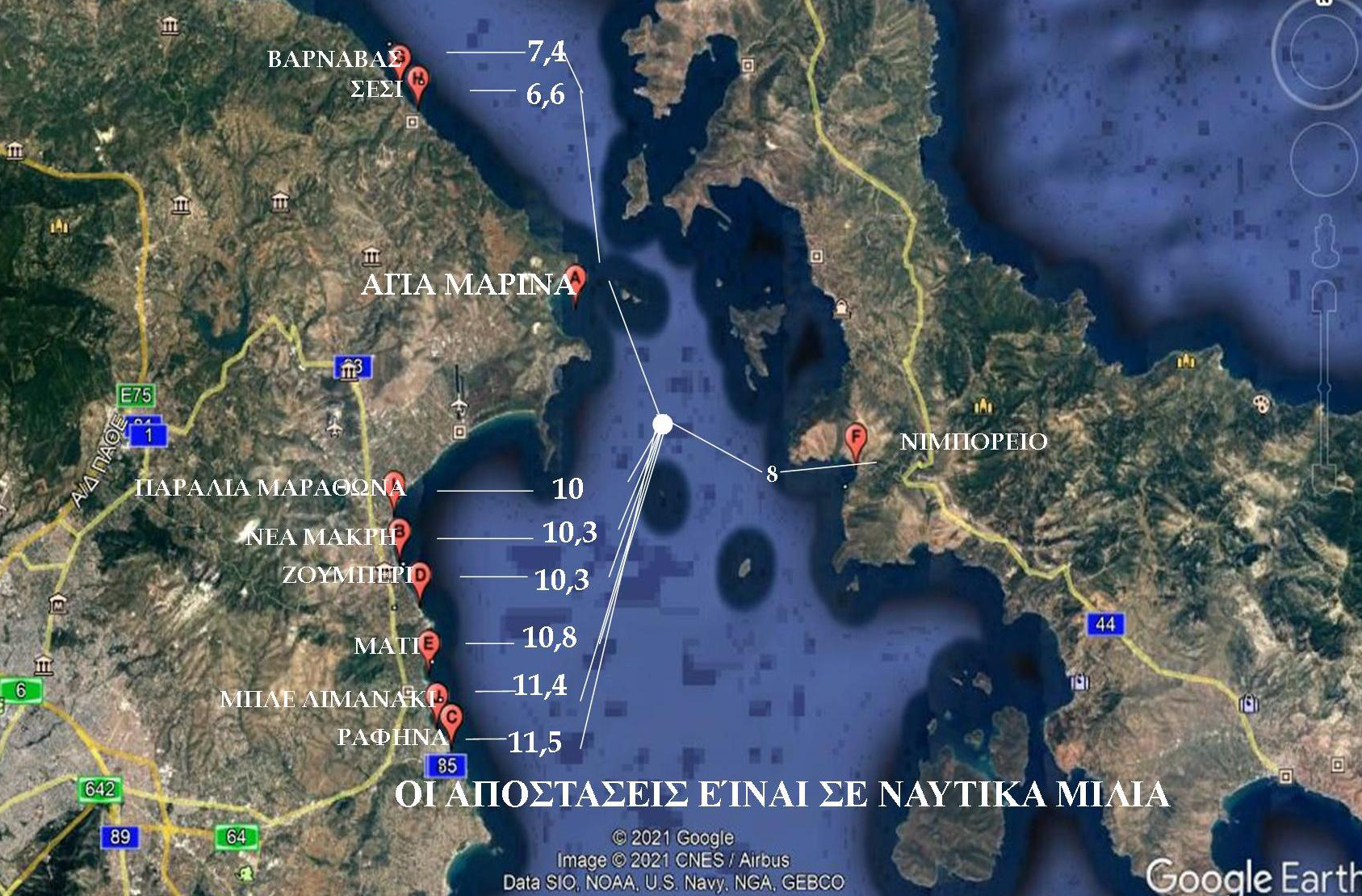 Τα καράβια αυτά είναι οι λεγόμενες «παντόφλες» και ελλιμενίζονται στο λιμάνι της Αγίας Μαρίνας. Στην επικράτεια δηλαδή του Δήμου Μαραθώνα. Είναι τα ferryboat που εξυπηρετούν τη γραμμή Αγία Μαρίνα – Νέα Στύρα. Τα πλοία αυτά μπορούν να καλύψουν την απόσταση μέχρι το Κόκκινο Λιμανάκι σε λιγότερο από μία ώρα. Στον χάρτη φαίνονται οι αποστάσεις της Αγίας Μαρίνας από «επίμαχα» σημεία.