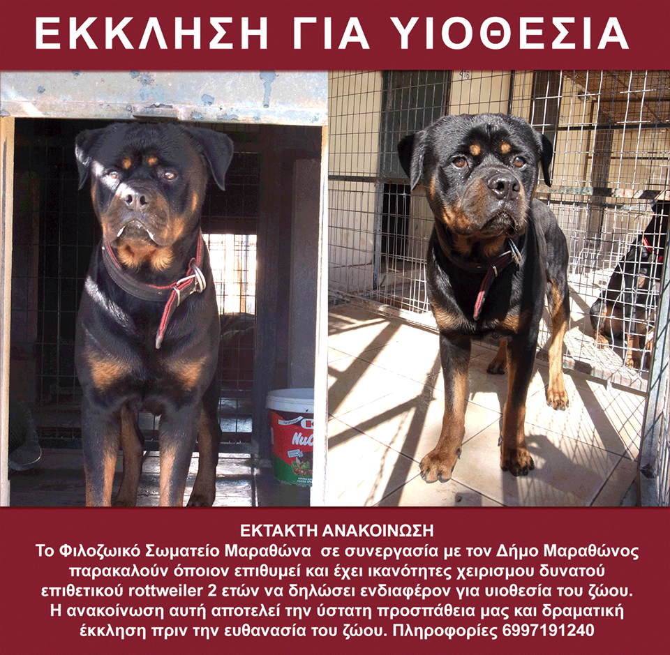 Πρόκειται για ένα Rottweiler 2 ετών. Ο σκύλος αυτός είναι πολύ δυνατός και επιθετικό, γι΄αυτό ο άνθρωπος που θα το υιοθετήσει πρέπει να γνωρίζει πως να το χειριστεί.