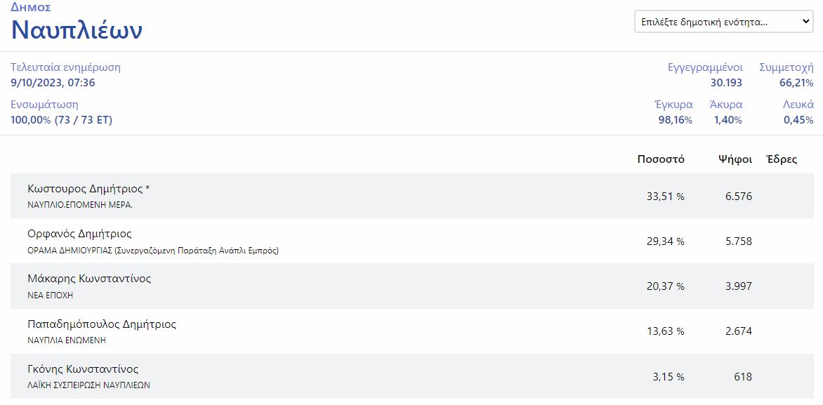 Το γεγονός αυτό δεν στάθηκε αρκετό για να στερήσει την πρωτιά από τον κ. Κωστούρο που στο 100% της ενσωμάτωσης επικράτησε με ποσοστό 33,51% έναντι 29,34% του κ. Ορφανού.