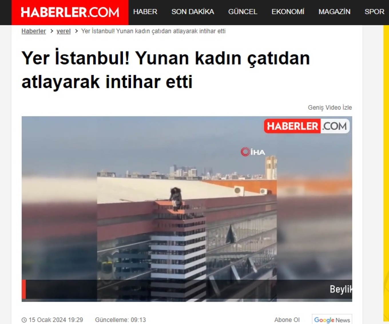 Βουτιά θανάτου από την οροφή εμπορικού κέντρου στην Κωνσταντινούπολη έκανε μία 54χρονη Ελληνίδα χθες Δευτέρα (15/1), με τα σοκαριστικά πλάνα από την αυτοκτονία της να κάνουν τον γύρο των τουρκικών ΜΜΕ.