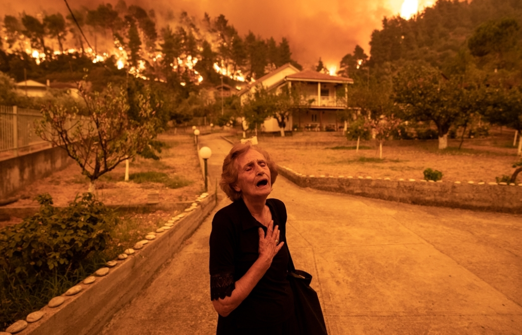 Μία φωτογραφία από τις πυρκαγιές που έκαψαν την Εύβοια προκάλεσε ρίγη συγκίνησης και ταξίδεψε εκτός συνόρων. Η κ. Παναγιώτα έγινε πρωτοσέλιδο στον ξένο Τύπο. Με μια κίνηση του χεριού της, με τα μάτια κλειστά και το στόμα ανοιχτό, δείχνει την απόγνωσή της τη στιγμή που πρέπει να εγκαταλείψει το σπίτι της στις Γούβες.