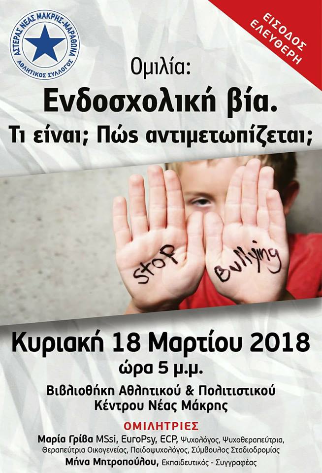Ο Αθλητικός Σύλλογος Αστέρας Νέας Μάκρης-Μαραθώνα σας προσκαλεί σε μια ομιλία με θέμα: «Ενδοσχολική βία. Τι είναι; Πώς αντιμετωπίζεται;».