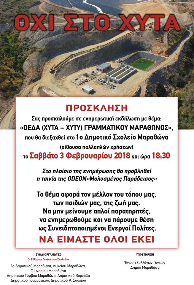 Οι Σύλλογοι Γονέων & Κηδεμόνων των Δημοτικών σχολείων του Μαραθώνα, με την υποστήριξη της Ένωσης Συλλόγων Γονέων Μαραθώνα, διοργανώνουν μια ενημερωτική εκδήλωση με θέμα: «ΟΕΔΑ (ΧΥΤΑ – ΧΥΤΥ) Γραμματικού Μαραθώνος».