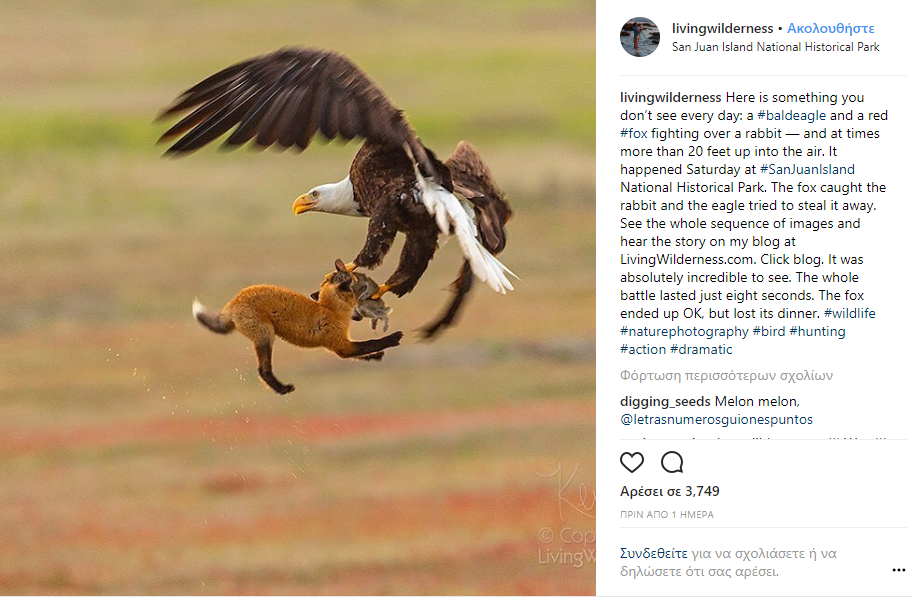Ένας φαλακρός αετός έχει παρασύρει μια νεαρή κόκκινη αλεπού που στα σαγόνια της είχε το νεκρό λαγό τον οποίο έχει μόλις σκοτώσει. Στην προσπάθεια αρπαγής της λείας από το πανίσχυρο πτηνό, η αλεπού βρίσκεται κυριολεκτικά στον αέρα.
