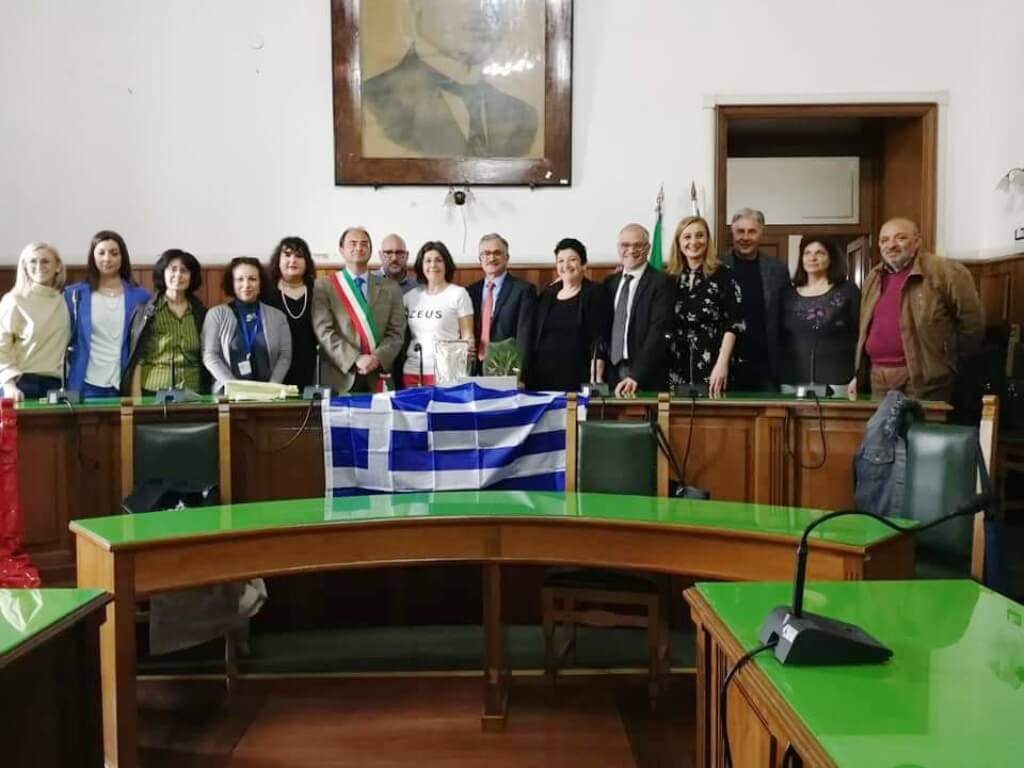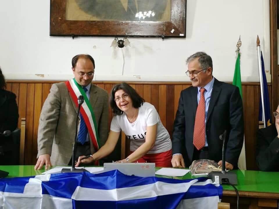 Ιδιαίτερη στιγμή αποτέλεσε η υπογραφή του Πρωτοκόλλου Αδελφοποίησης μεταξύ των δύο σχολείων μέσα στην αίθουσα του Δημαρχείου της πόλης, παρουσία του Δημάρχου, ο οποίος μίλησε με θέρμη για το αμείωτο ενδιαφέρον των νέων Ιταλών σε ό,τι αφορά στη σχέση της ελληνικής με την ιταλική γλώσσα διαχρονικά, αλλά και για τους στενούς δεσμούς που συνδέουν τις δύο χώρες, από την αρχαιότητα μέχρι και σήμερα.