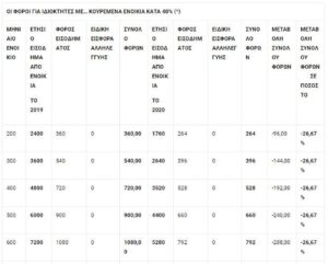 Εξαιτίας της μείωσης των φορολογητέων εισοδημάτων τους κατά 20%-30%, αλλά και λόγω της μη επιβολής ειδικής εισφοράς αλληλεγγύης, τα ποσά των φόρων που θα κληθούν να καταβάλουν οι συγκεκριμένοι ιδιοκτήτες ακινήτων, με τα εκκαθαριστικά των φετινών φορολογικών δηλώσεων, θα είναι μειωμένα κατά 27% έως και 49%.