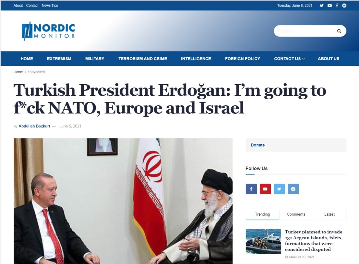 Τα εξωφρενικά σχόλια του Ερντογάν – συνεχίζει το Nordic Monitor – διατυπώθηκαν κατά τη διάρκεια μιας συνομιλίας σχετικά με την προτεινόμενη δημιουργία νέας βάσης ραντάρ στην περιοχή Kürecik της Μαλάτια ως μέρος του πυραυλικού αμυντικού συστήματος του ΝΑΤΟ.