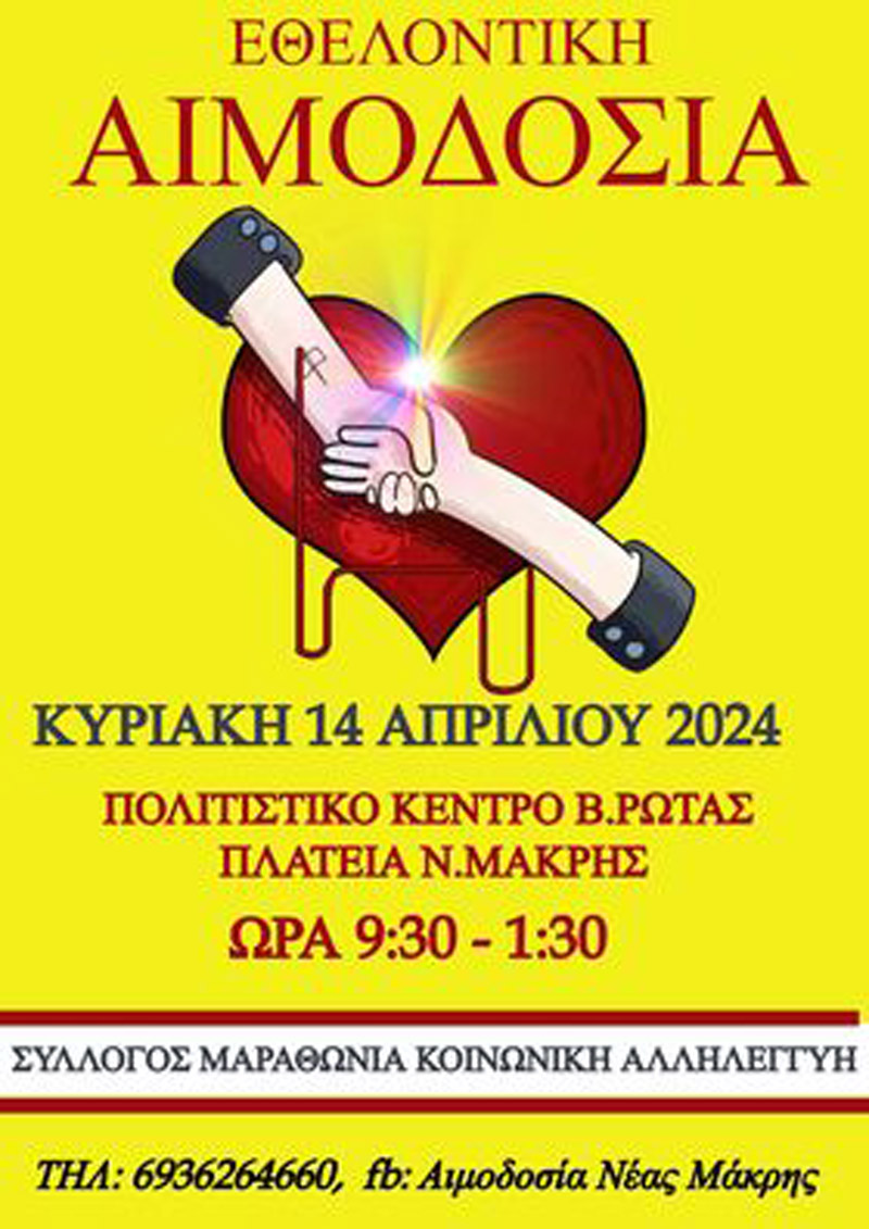 Εθελοντική αιμοδοσία θα πραγματοποιηθεί την Κυριακή 14 Απριλίου στη Νέα Μάκρη, με πρωτοβουλία του Συλλόγου Μαραθώνια Κοινωνική Αλληλεγγύη.
