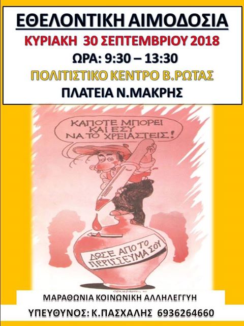 Την Κυριακή 30 Σεπτεμβρίου, από τις 9 και μισή το πρωί μέχρι τη 1 και μισή το μεσημέρι, όσοι το επιθυμούν μπορούν να βρεθούν στο Πολιτιστικό Κέντρο «Βασ. Ρώτας» στην πλατεία της Νέας Μακρης και να προσφέρουν το πολύτιμο αυτό δώρο, να χαρίσουν κυριολεκτικά ζωή.