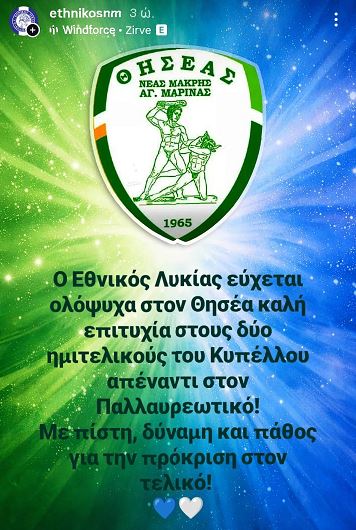 Σε μια πολύ όμορφη κίνηση προχώρησε ο Εθνικός Λυκίας καθώς με σημερινό στόρι του στο Instagram ευχήθηκε καλή επιτυχία στον Θησέα, για τον πρώτο ημιτελικό Κυπέλλου κόντρα στον Παλλαυρεωτικό.