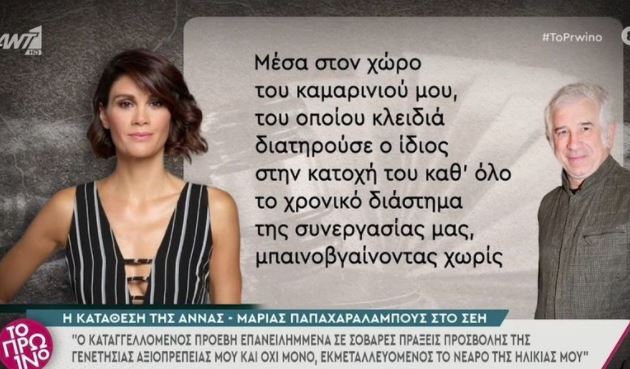 «Μέσα στο χώρο του καμαρινιού μου, του οποίου κλειδιά διατηρούσε ο ίδιος στην κατοχή του καθ’ όλο το χρονικό διάστημα της συνεργασίας μας, μπαινοβγαίνοντας χωρίς να χτυπά την πόρτα μου και ορισμένες φορές κλειδώνοντας την πόρτα πίσω όπως έμπαινε, ο καταγγελλόμενος προέβη επανειλημμένα σε σοβαρές πράξεις προσβολής της γενετήσιας αξιοπρέπειας μου και όχι μόνο, εκμεταλλευόμενος το νεαρό της ηλικίας μου, 24ων ετών, την ανάγκη μου να εργαστώ και τον φόβο που μου είχε εμφυσήσει. Πέραν των εν λόγω πράξεων, με τις οποίες προσέβαλε κατ’ εξακολούθηση τη γενετήσια αξιοπρέπειά μου και μέσα στο πλαίσιο της νοσηρής επιθυμίας του να με μειώνει και να με ταπεινώνει συστηματικά με διάφορους τρόπους, αρκετές φορές εισερχόταν στο καμαρίνι μου, ενώ βρισκόμουν μέσα σε αυτό με κλειστή την πόρτα, κατέβαζε το παντελόνι του και ουρούσε επιδεικτικά στο νιπτήρα του καμαρινιού μου, ο οποίος βρισκόταν ακριβώς πίσω από εκεί που καθόμουν.