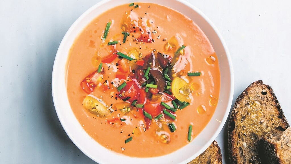 Ένα παραδοσιακό ισπανικό πιάτο στη δική μας, πιο ελληνική, εκδοχή του. Μία κρύα σούπα, φόρος τιμής, στην αυγουστιάτικη ντομάτα, που είναι στα καλύτερά της. Σε ένα μεγάλο μπολ θα κόψουμε τα λαχανικά, που δεν είναι άλλα από αυτά που περιέχονται στη χωριάτικη σαλάτα, μαζί με τη φέτα και το ψωμί κομμένο, σε μικρά σχετικά κομμάτια. Θα προσθέσουμε το λάδι, το μηλόξυδο και το αλατοπίπερο και θα αφήσουμε το μείγμα στο ψυγείο για τουλάχιστον μία ώρα, αν όχι για ένα ολόκληρο βράδυ. Πολτοποιούμε πολύ καλά σε μπλέντερ και σερβίρουμε.
