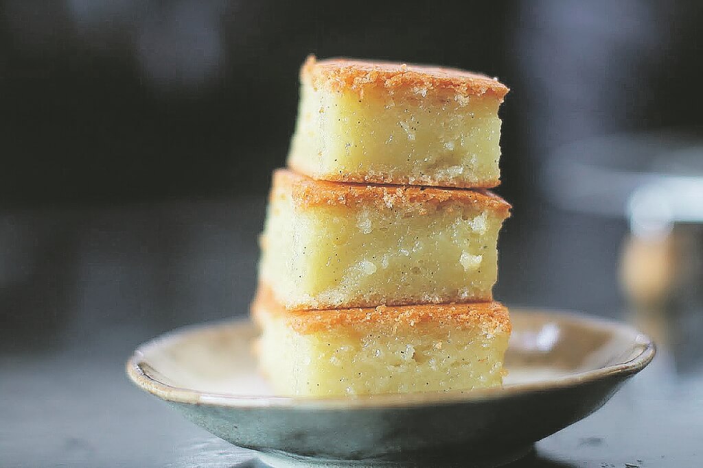 Η επιρροή της Ιαπωνικής κουζίνας στη χαβανέζικη είναι σημαντική και αυτό είναι ένα ακόμη τέτοιο παράδειγμα. Λιώνουμε το βούτυρο και ενώνουμε με τα υπόλοιπα υγρά υλικά σε ένα μεγάλο μπωλ. Σε ένα άλλο μπωλ ενώνουμε τα στερεά υλικά και σιγά σιγά προσθέτουμε τα υγρά μέχρι να ομογενοποιηθεί το μείγμα. Ψήνουμε σε ταψί καλυμμένο με λαδόκολλα στους 180οC για 1 ώρα και όταν κρυώσει κόβουμε σε κύβους. Αξίζει τον κόπο να πάτε σε κάποιο ασιατικό μάρκετ για να βρείτε το mochiko flour ή αλλιώς glutinous rice flour ώστε να πετύχετε το επιθυμητό αποτέλεσμα που είναι το μαστιχωτό αυτό κέικ.