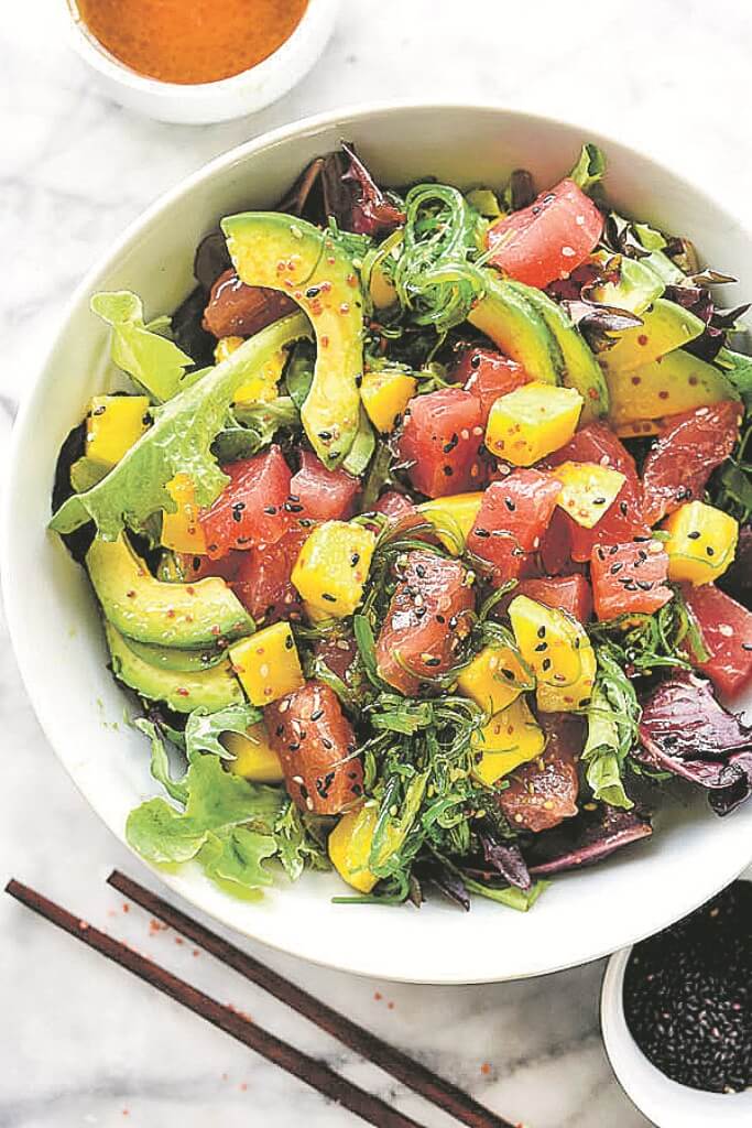 Για αρχή θα κάνουμε μια παραλλαγή ενός παραδοσιακού χαβανέζικου πιάτου που ονομάζεται ποκέ και είναι σαν τον σέξυ ξάδερφο του σούσι. Πρόκειται για μια σαλάτα με ωμό ψάρι, συχνά σερβιρισμένη σε βάση ρυζιού ή και σκέτη. Δεν έχετε παρά να ανακατέψετε τα υλικά της σάλτσας με τα λαχανικά, τα φρούτα και το ψάρι να πασπαλίσετε από πάνω το σουσάμι και το ποκέ σας είναι έτοιμο. Φυσικά οι συνδυασμοί είναι αμέτρητοι οπότε αφήστε ελεύθερη τη φαντασία σας και αυτοσχεδιάστε.