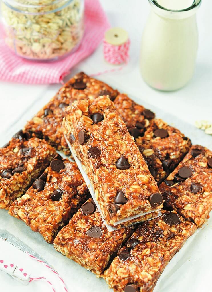 Προσθέτουμε από πάνω τις σταγόνες κουβερτούρας. Βάζουμε το ταψί στο ψυγείο και το αφήνουμε περίπου μία ώρα μέχρι να «δέσει». Οι μπάρες μας χρειάζονται μόνο κόψιμο κι είναι έτοιμες.