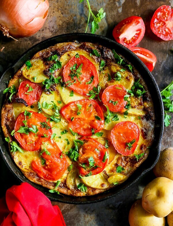 - 1-2 ντομάτες, κομμένες σε ροδέλες σαν τις πατάτες, αλατοπιπερωμένες