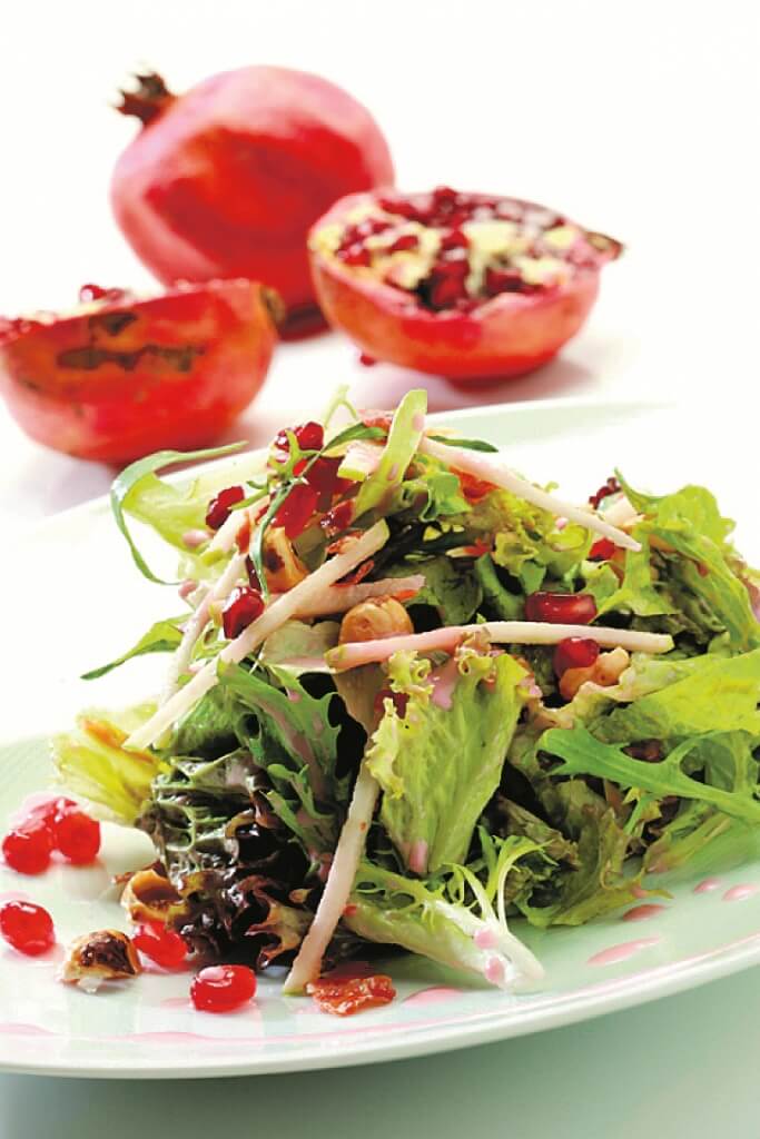 Ανάμεικτη σαλάτα με ρόδι, πράσινο μήλο, τραγανό προσούτο, φουντούκι και βινεγκρέτ ρόδι