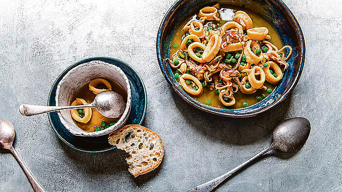 Καλαμάρι με σόγια, μέλι, πορτοκάλι και αρακά