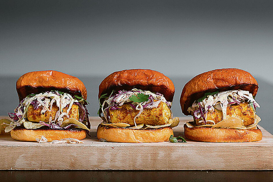 Μπέργκερ με φιλέτο μπακαλιάρου, κάρυ και κόλσλοου